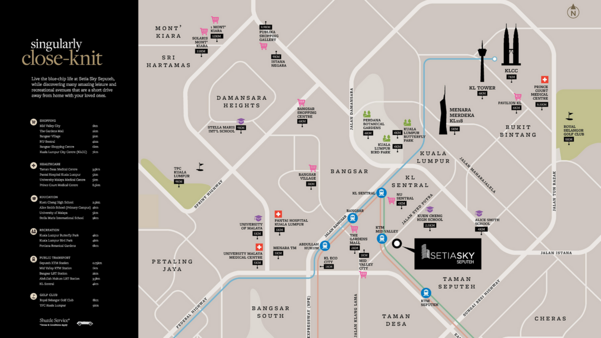 Setia Sky Seputeh is located in a centralized location. It is easily accessible via Federal Highway, North-South Highway, NPE, MEX. It takes a 3-6KM drive to the top 3 CBD of Malaysia - KLCC, Bangsar South and KL Sentral.
